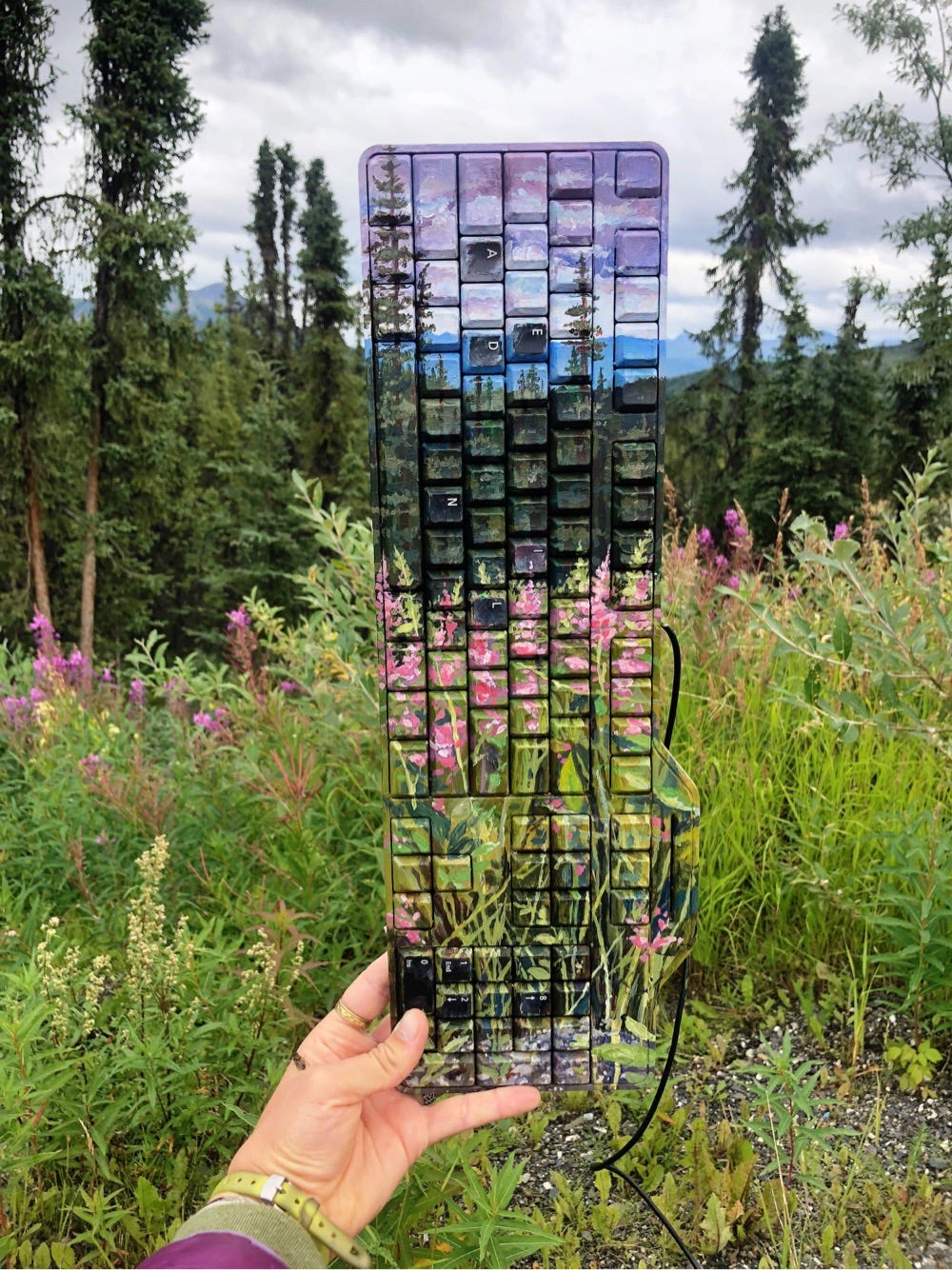 MARIAH READING USES UNIQUE CANVASES for her paintings. When the nomadic park ranger and frequent artist-in-residence finds lost objects and trash while adventuring in state and national parks across America, she paints the surrounding landscape on the item, highlighting waste and showcasing the beauty of the protected areas. She has captured the morning light flooding through the gaps between redwood trees at Big Sur on a lost Croc, mimicked the steep cliffs of Channel Islands National Park on a flipper, and—on a forgotten helmet—depicted riotously colorful fall leaves wreathing the banks of a placid lake in Acadia National Park.