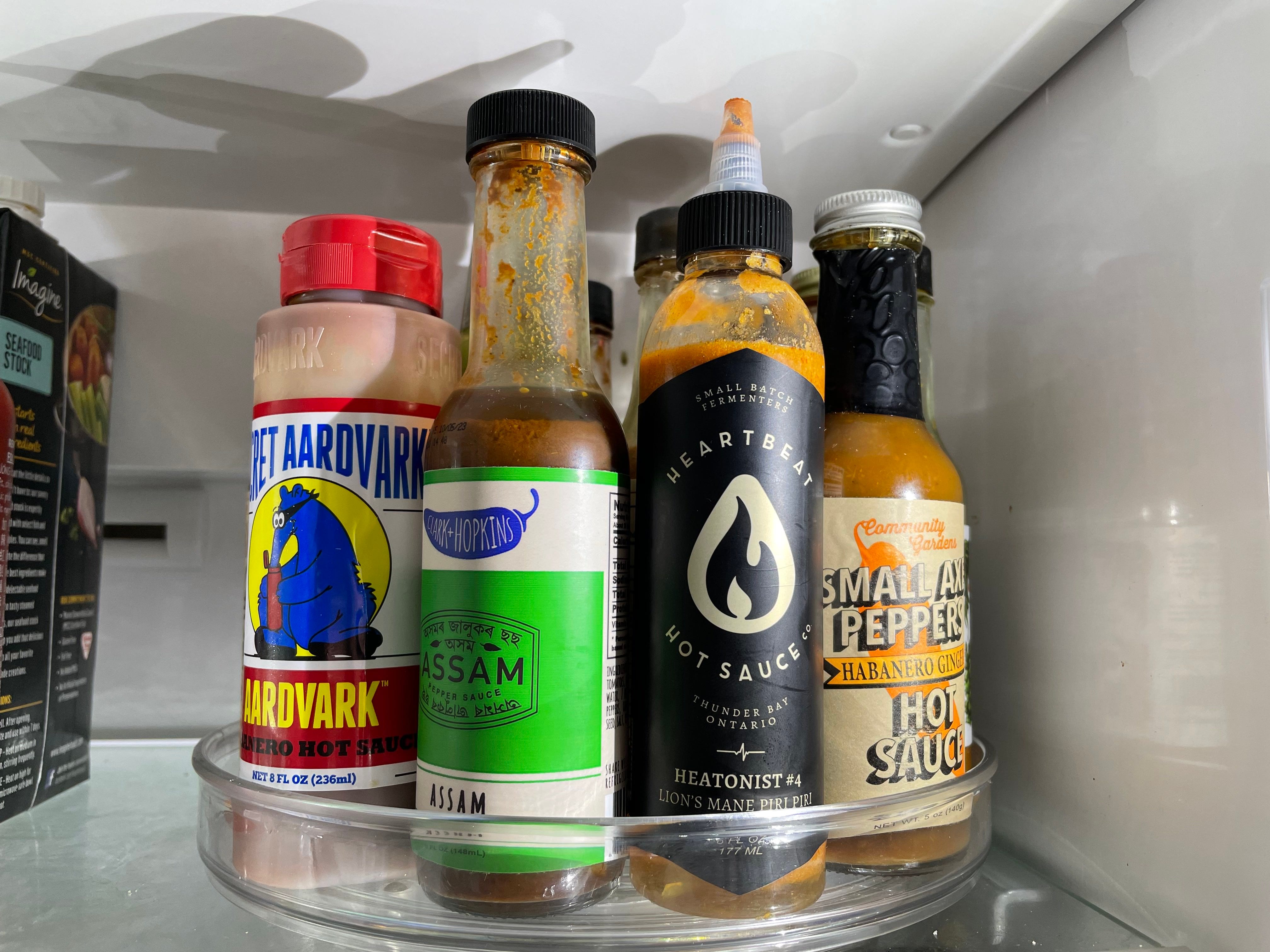 One recent fridge organization trick I did recently was to put in a 9” lazy susan to make it easier to grab hot sauces. I was tired of reaching back through various bottles and condiments to find the one I wanted. For 10-$15, it’s one of the best things I’ve done recently in home organization.
